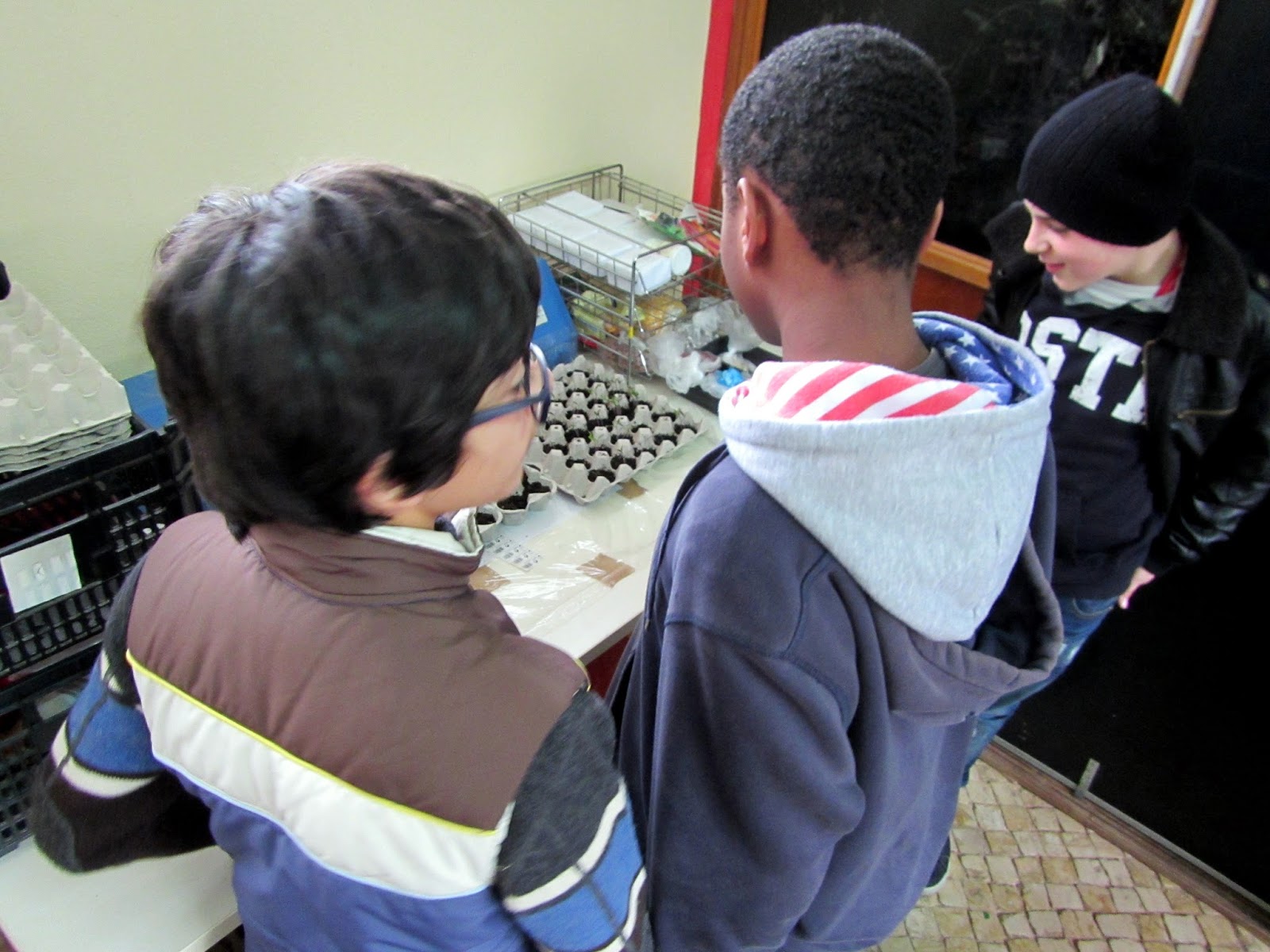 No dia 17 de março na turma D do 6º ano, numa aula de educação tecnológica, foram abordadas questões ligadas ao planeta Terra e à sua sustentabilidade. No decurso desta problemática, os alunos Filipa Borges e Massimo Zhang responderam ao repto de, numa caixa de ovos colocarem terra e semearem tomate cereja levando depois para casa para durante as férias cuidarem da sua rega.